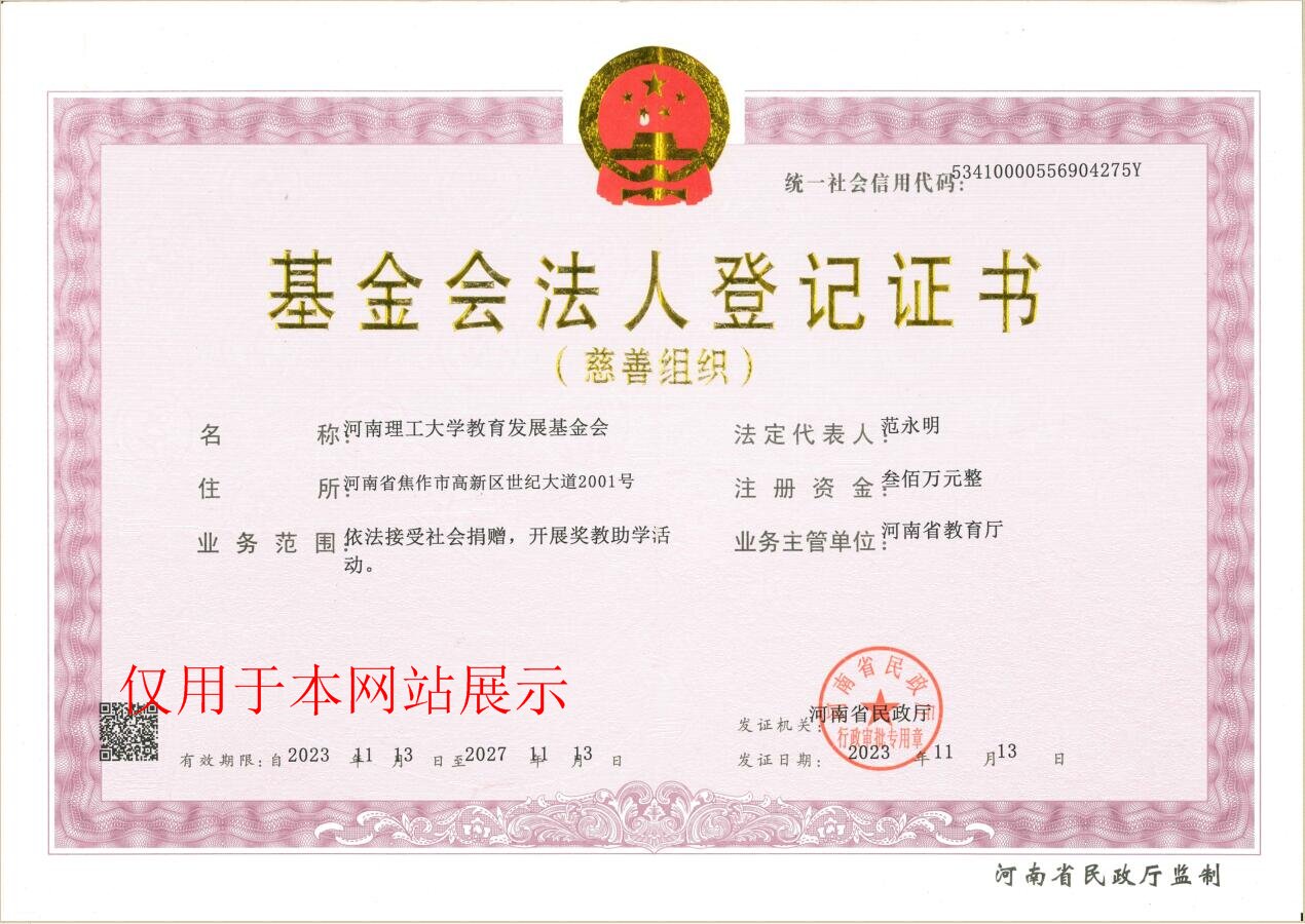 河南理工大学教育发展基金会成立于2010年6月,是经河南省民政厅批准成立的非公募基金会,业务主管单位是河南省教育厅。本基金会具有公益性捐赠税前扣除资格和非盈利性组织免税资格,2018年被河南省民政厅认定为慈善组织,2019年、2024年被评为AAAA等级社会组织,2019年-2024年连续六年获得“中基透明指数FTI”满分评价,获评透明自律奖。基金会积极与国内高校进行交流和学习,是中国高等教育学会教育基金工作研究分会会员单位。