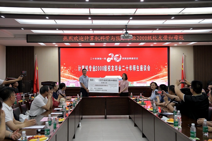 计算机科学与技术专业2000级校友向学校基金会捐赠人民币壹拾万壹仟壹佰元整,作为“计算机学院建设发展基金”,用于支持计算机学院文化、体育等相关项目建设,如学院运动场地建设、院楼文化墙、院内天井改造、橱窗以及楼外、走廊及功能室的文化布置等。计算机学院党委书记许辉代表学院接受2000级校友捐赠。校友代表李爱国介绍了本次返校聚会和捐赠的筹备情况,表达了感恩母校、以母校为荣的真挚感情。