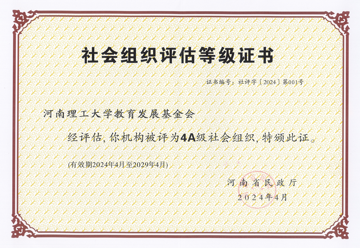 近期,省民政厅发布《关于2023年度慈善组织(基金会)评估等级结果认定的通知》(豫民文【2024】78号),我校教育发展基金会再次获评4A级社会组织。