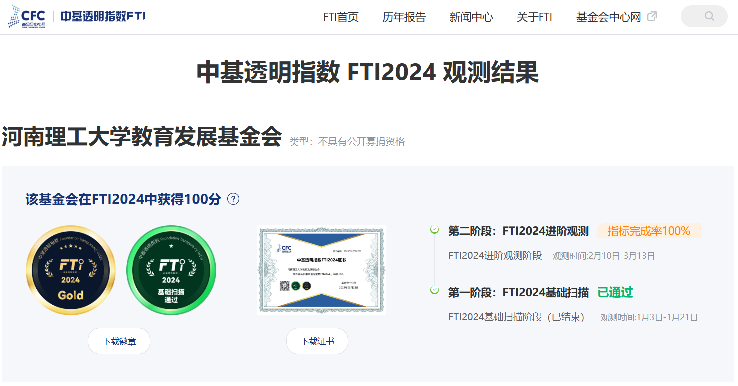 日前,公益行业信息透明度的重要指标——中基透明指数FTI2024的观测结果正式发布,通过“基础扫描+进阶观测”双阶段评估,河南理工大学教育发展基金会获得100分成绩。这是我校基金会自2019年参评以来,第6次获得FTI满分评价。