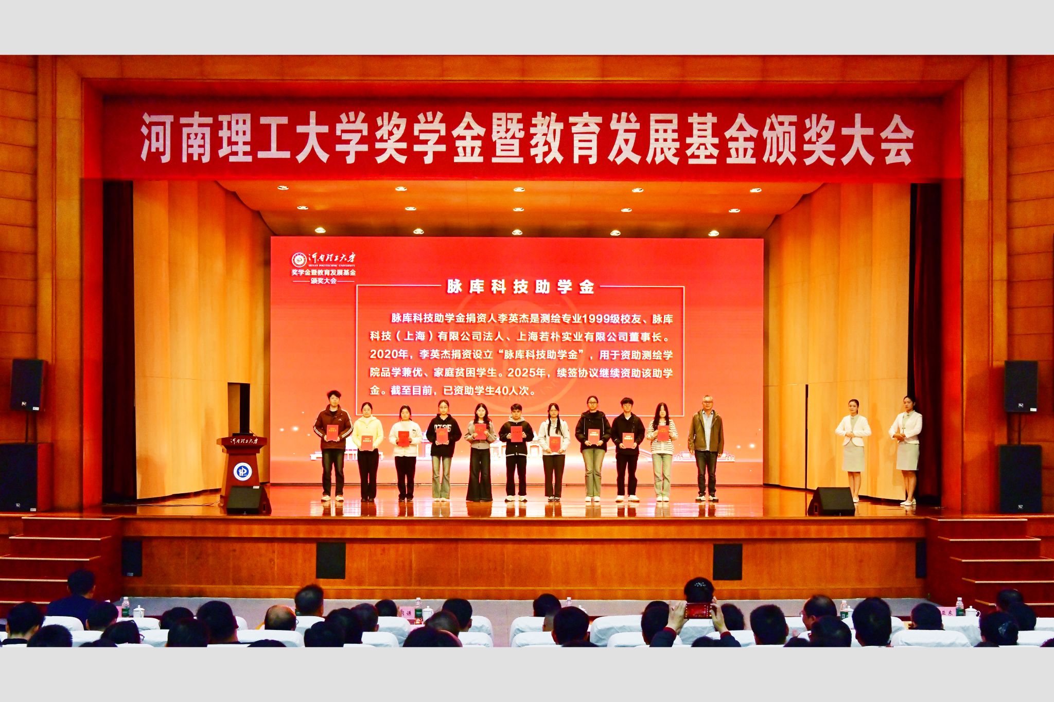 11月11日下午,学校奖学金暨教育发展基金颁奖大会在南校区明德楼音乐厅举行。地勘1982级校友、德矿九鼎科技有限公司董事长马桂霞,机制1982级校友、河南和信企业集团董事长姚晓峰,矿机1982级校友、广东华楠骏业机械制造有限公司董事长柳雪春,测绘1999级校友、上海若朴实业有限公司董事长李英杰,工商2014级校友、第一创业证券股份有限公司首席顾问王威应邀出席,校领导刘永涛、赵同谦、李振华、边亚东,相关职能部门和学院负责人、获奖师生等600余人参会。副校长李振华主持大会。
