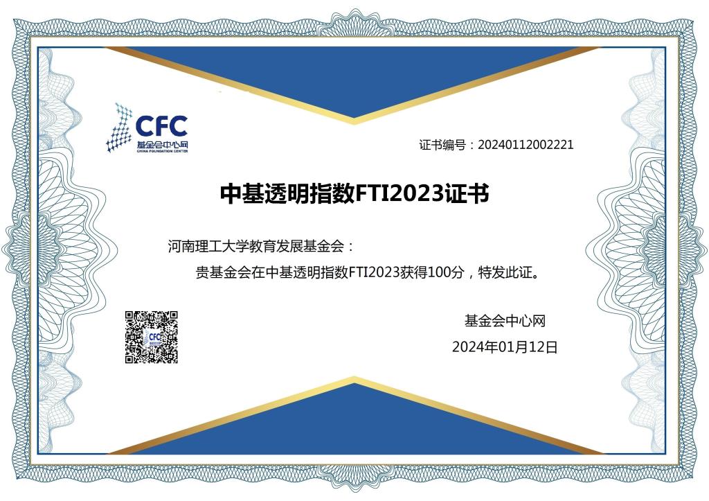 1月12日,中国基金会行业数据发布会在北京举办。发布会以 “阳光慈善,让数据说话” 为主题,发布了《中基透明指数FTI2023报告》等行业数据,国内2570家基金会参加评选。河南理工大学教育发展基金会再次获得100分的满分评价。